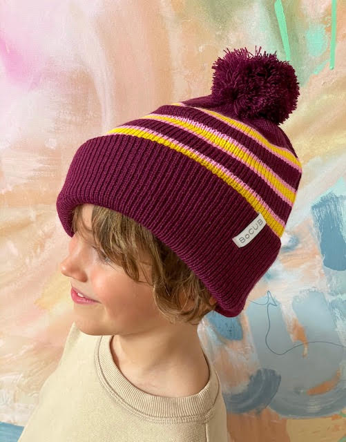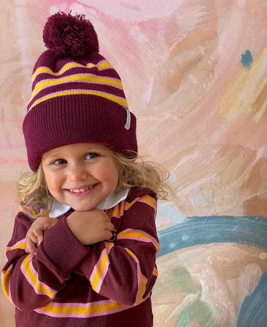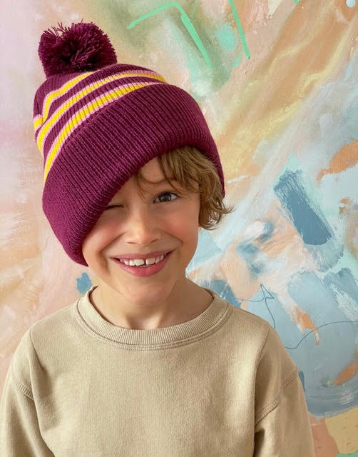 Made with striped, soft, coloured yarn and designed to be snug, cosy and warm. Made for you and your little ones, who are too busy with wild imaginations and make-believe games to care about hair. Gary is enough of a character solo, but can be matched with your mini or, have your mini match 'The Gary' rugby. Now, thats quite a mouthful!